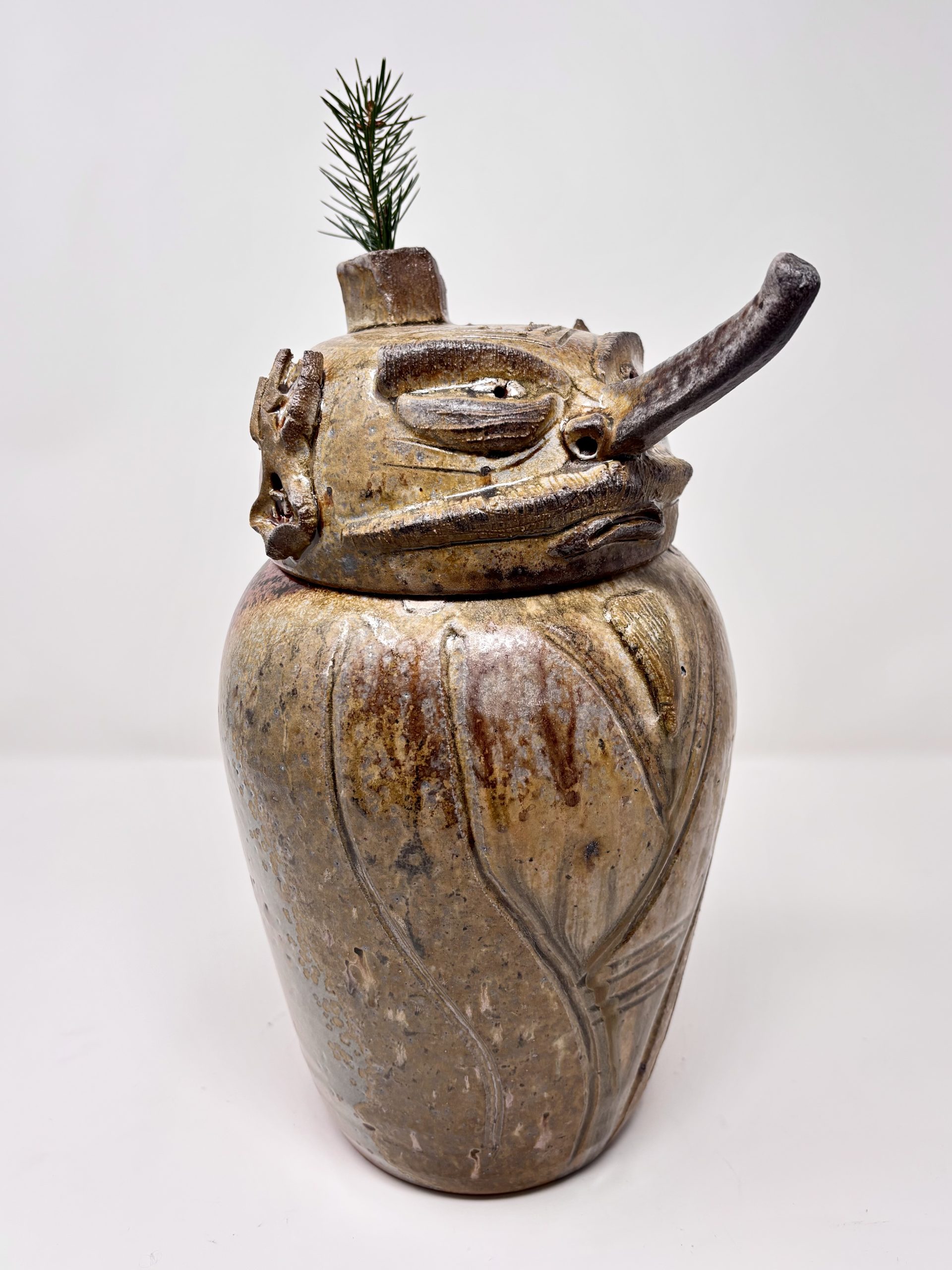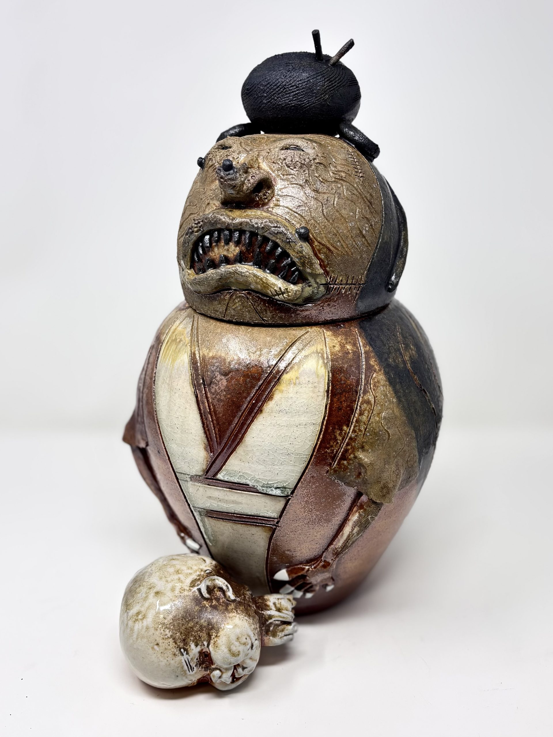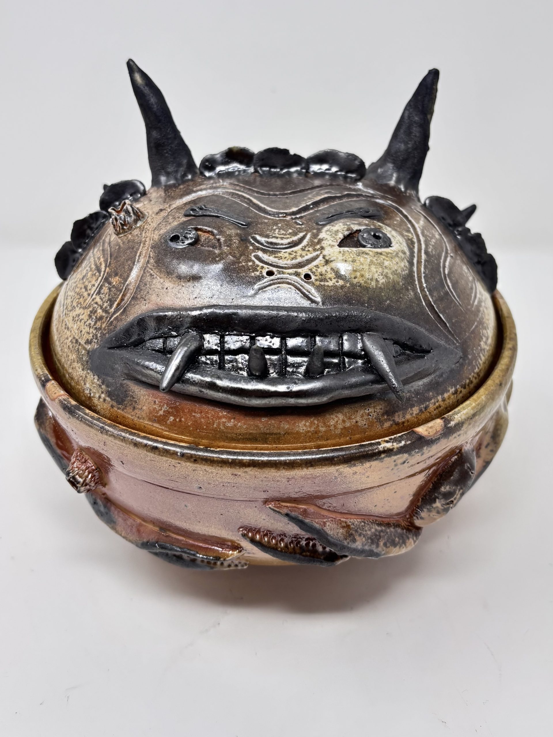 The work in Hafu Potter – Random Yokai is born from a meeting place of clay, fire, and story. Yokai are the supernatural beings, tricksters, and spirits of Japanese folklore—creatures that blur the line between the ordinary and the extraordinary. At once mischievous, grotesque, and wise, they embody the playful, unsettling, and often contradictory world of the imagination. These jars, jugs, and vases channel that spirit, giving form to figures that remind us the world is never as straightforward as we might wish.